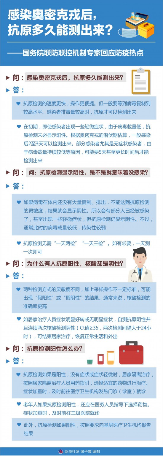 为进一步优化新冠病毒检测策略,做好防控工作,国务院联防联控机制综合组近日印发了《新冠病毒抗原检测应用方案》等文件。感染奥密克戎后,抗原多久能测出来?抗原“阳”了怎么办?围绕公众关注的热点问题,国务院联防联控机制有关专家作出专业解答。