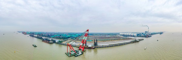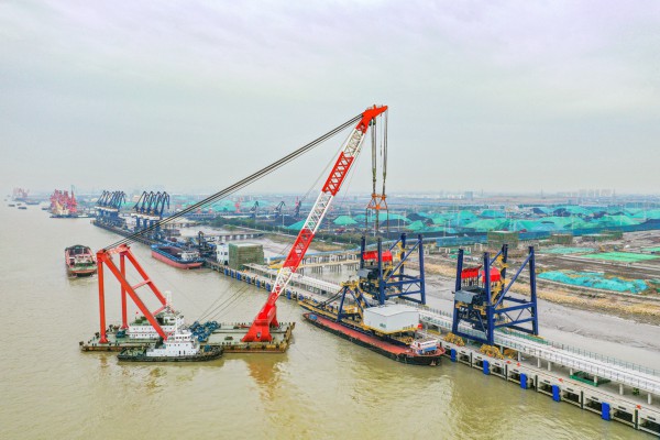 继10月下旬深国际智慧物流港区码头水工部分主体结构完工后,项目方加快安装港机设备,其中,5台抓斗卸船机分2批进场安装。截至12月8日,首台卸船机分成上下两部分,通过浮吊船完成吊装对接,未来主要承担接卸煤炭等大宗散货的工作任务。
