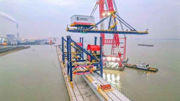 12月8日晚,在江苏省靖江市深国际智慧物流港区码头,首台自重1200吨的卸船机成功安装到位。该台卸船机额定效率达到1800吨/小时,是目前长江沿线同货种效率最高、外形尺寸和整机重量最大的抓斗卸船机,亮出了智慧物流港区的“实力牌”。