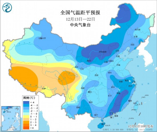 未来10天,冷空气活动频繁且势力较强,除青藏高原气温偏高2℃左右外,我国大部地区平均气温较常年同期持续明显偏低,其中新疆、内蒙古、江南东部、华南等地偏低2~4℃,局地偏低5℃以上。