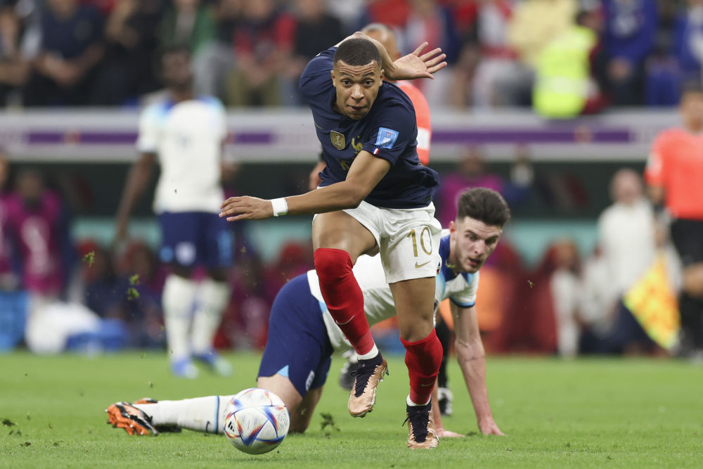 12月10日,法国队球员姆巴佩(前)在对英格兰队的比赛中进攻。新华社记者 潘昱龙 摄