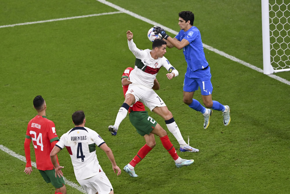 12月10日,摩洛哥队守门员布努(右一)在对阵葡萄牙队的比赛中扑救。新华社记者 李俊东 摄