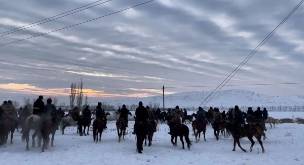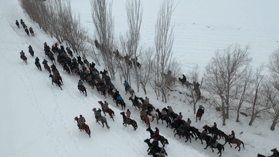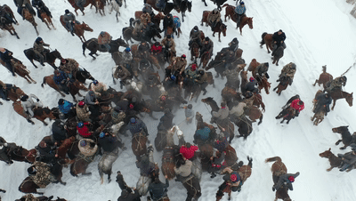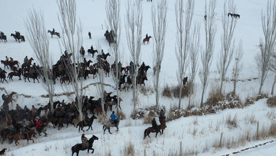 冬日的霍尔果斯银装素裹,骑手们穿戴整齐,骑着马儿陆续到场,相互握手问候,欢笑声响彻大地。壮硕的马儿饱满的肌肉与光滑如绸的毛皮在阳光下闪闪发亮,时而高亢、时而低吟的嘶鸣声在旷野中起伏飘荡。