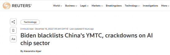 今年10月,美国商务部公布一系列针对集成电路领域的出口管制措施,从技术、产品、设备、服务等方面对中国进行全面限制,以阻断中国研发和生产先进半导体芯片的能力。与此同时,美国政府还敦促荷兰、日本和其他拥有尖端设备制造公司的未指明国家和地区跟随美国的脚步,对华采取类似出口管制规则。根据媒体此前报道,有消息人士称拜登政府最快可能在本周宣布将包括长江存储等在内的30多家中国企业列入实体清单,限制这些公司从美国购买材料和配件。