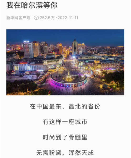 但当人们对这座城市投射出同样的热爱与好奇时,就不难解释,一篇综合介绍哈尔滨历史、文化、建筑、音乐、冰雪风光的稿件会“出圈”了。