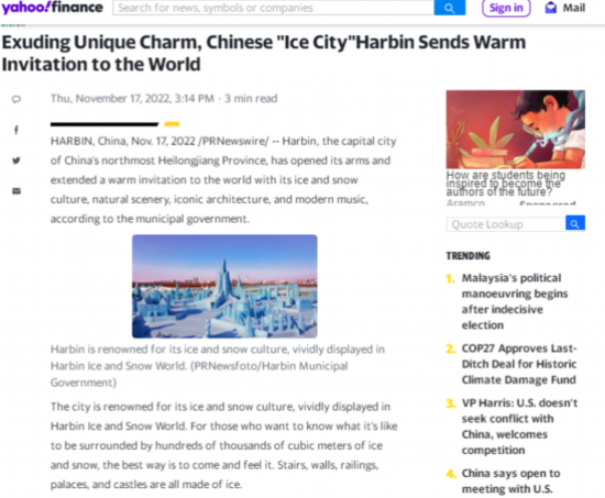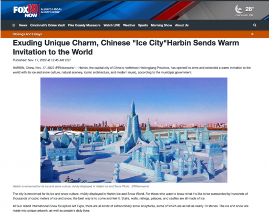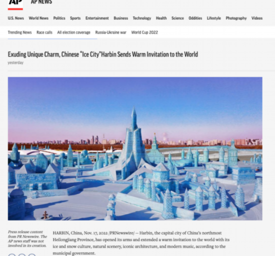 美联社播发了题为《散发着独特魅力的中国“冰城”哈尔滨向世界发出热情邀请》的文章,并介绍,这座城市已经张开双臂,以其冰雪文化、自然风光、标志性建筑和现代音乐向世界发出了热情邀请。