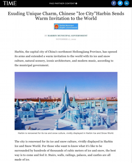 《时代》周刊在报道中提到:“哈尔滨人的冰雪DNA,在第一场雪落下的时候被唤醒。冰雪被制成独特的艺术品,成为人们日常生活的一部分。”