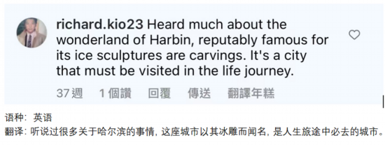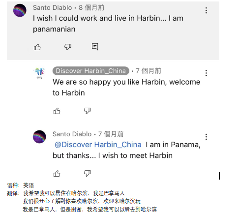 数以万计的国外网民表达了对哈尔滨这座城市的向往之情。“听说过很多关于哈尔滨的事情,这座城市以其冰雕而闻名,是人生旅途中必去的城市”“我是巴拿马人,但是谢谢,我希望我可以以后去到哈尔滨”“我怀念所有的中国美食和厨师”“宏伟的建筑,视野开阔”……