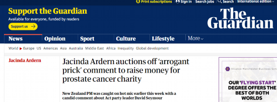 【环球网报道 记者 索炎琦】新西兰总理“爆粗”事件有后续。据英国《卫报》15日报道,在她于当地时间周二(13日)进行的议会辩论上,因话筒没关、不小心被听到“爆粗”——小声斥责一名反对派领导人西摩为“傲慢的混蛋”后,这两名“政坛对手”在随后联手合作,决定将当时相关文字记录副本进行拍卖,二人也都签了名,最后拍卖所得将捐赠至前列腺癌慈善机构。