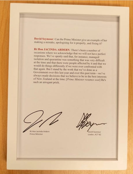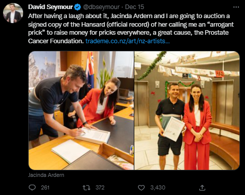 值得注意的是,事件另一位当事人新西兰行动党领导人大卫·西摩15日在社交媒体推特上发文,介绍活动情况,“在大笑之后,阿德恩和我打算拍卖一份她称我为‘傲慢的混蛋’的议事录(议会官方文字记录)签名副本,为各地的‘混蛋’筹集资金,这是一项伟大的事业,(为)前列腺癌基金会(筹款)。”下方还配上了自己与阿德恩的合影,以及他在副本上签名的照片。↓