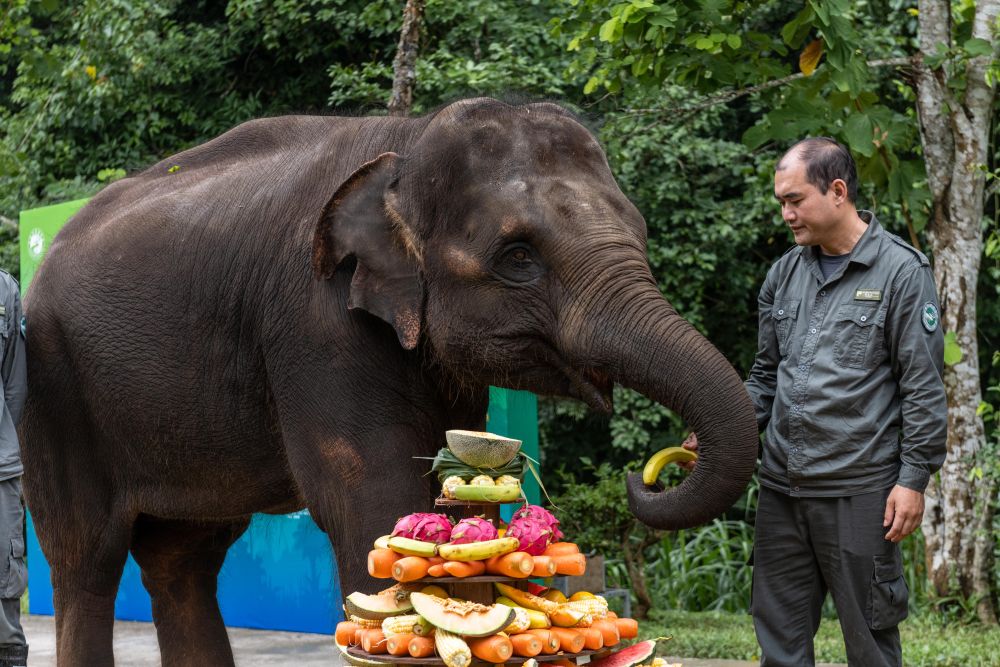 8月12日,在救助象“羊妞”的七周岁生日会上,“象爸爸”陈继铭给“羊妞”喂香蕉。新华社记者 曹梦瑶 摄