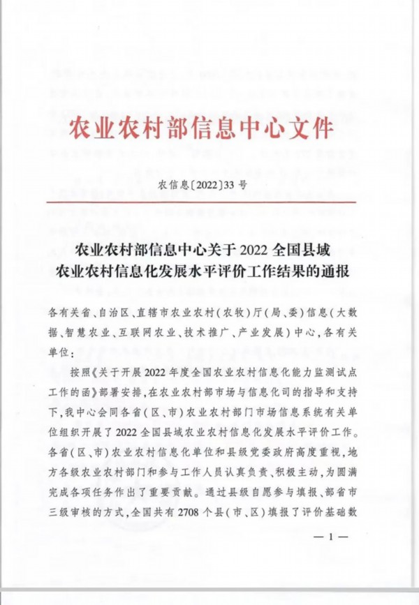 近日,农业农村部信息中心发布《关于2022全国县域农业农村信息化发展水平评价工作结果的通报》,我区获评2022全国县域农业农村信息化发展先进县。