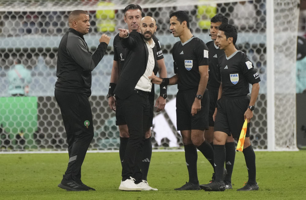 12月17日,摩洛哥队主教练瓦利德·雷格拉吉(左三)在比赛后与主裁判阿尔·贾西姆(右三)交流。新华社记者 孟永民 摄