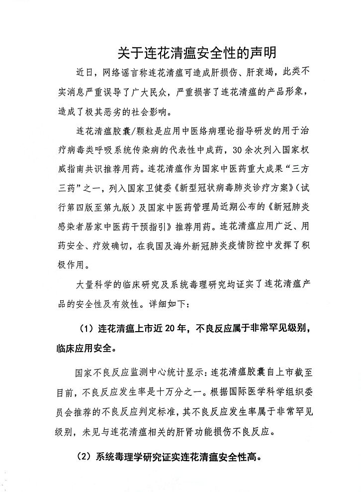 以岭药业表示,连花清瘟胶囊自上市截至目前,不良反应发生率是十万分之一,临床应用安全;系统毒理学研究证实连花清瘟安全性高;荟萃分析表明连花清瘟安全性良好。