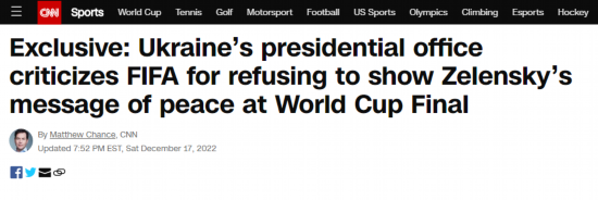 据美国有线电视新闻网(CNN)报道,对于该媒体此前曝出“国际足联拒绝乌克兰总统泽连斯基要求在18日卡塔尔世界杯决赛开赛前分享有关和平信息”,乌克兰总统办公室周六(17日)发声批评,表示即便国际足联决定不播放该视频,乌方也会独立发布。
