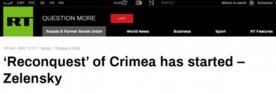 RT称,根据泽连斯基的说法,基辅仅仅反复声明“克里米亚半岛是乌克兰领土的一部分”是不够的。他还称,俄罗斯几乎不会放弃克里米亚,乌克兰应该准备好通过武力将其“重新夺回”。