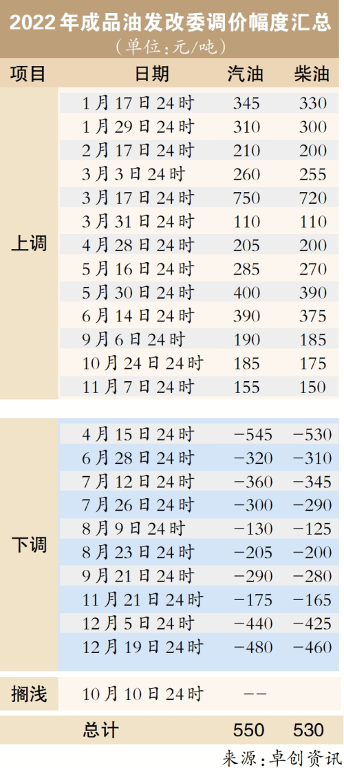 据卓创资讯了解,此次调价落地后,2022年国内成品油零售限价共历经24次调整,其中13次上调,10次下调,1次搁浅,涨跌互抵之后,汽、柴油累计分别上涨550元/吨、530元/吨,折升价92#汽油、95#汽油、0#柴油分别为0.43元、0.46元、0.45元。