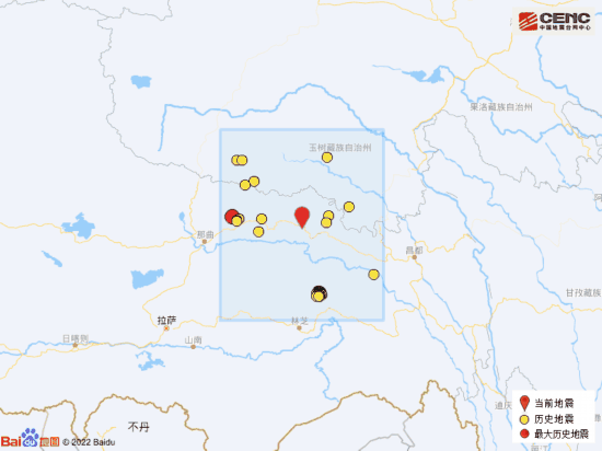 历史地震:根据中国地震台网速报目录,震中周边200公里内近5年来发生3级以上地震共104次,最大地震是2021年3月19日在西藏那曲市比如县发生的6.1级地震(距离本次震中160公里),按震级大小前50次历史地震分布如图。