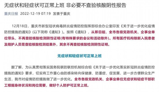 据重庆日报消息,12月18日,重庆市新型冠状病毒肺炎疫情防控指挥部综合办公室印发《关于进一步优化疫情防控措施的通知》(以下简称《通知》)。
