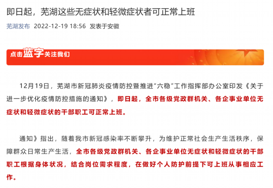 据“芜湖发布”消息,12月19日,芜湖市新冠肺炎疫情防控暨推进“六稳”工作指挥部办公室印发《关于进一步优化疫情防控措施的通知》,即日起,全市各级党政群机关、各企事业单位无症状和轻微症状的干部职工可正常上班。