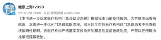 荔枝新闻讯 据健康上海12320消息,根据上海市当前疫情形势,为方便市民看病就医,上海市进一步优化门急诊就医流程,即日起上海全市各医疗机构对门急诊患者不再查验核酸阴性证明。各医疗机构严格落实首诊负责制和急危重症抢救制度,严禁以任何理由推诿或延误救治。