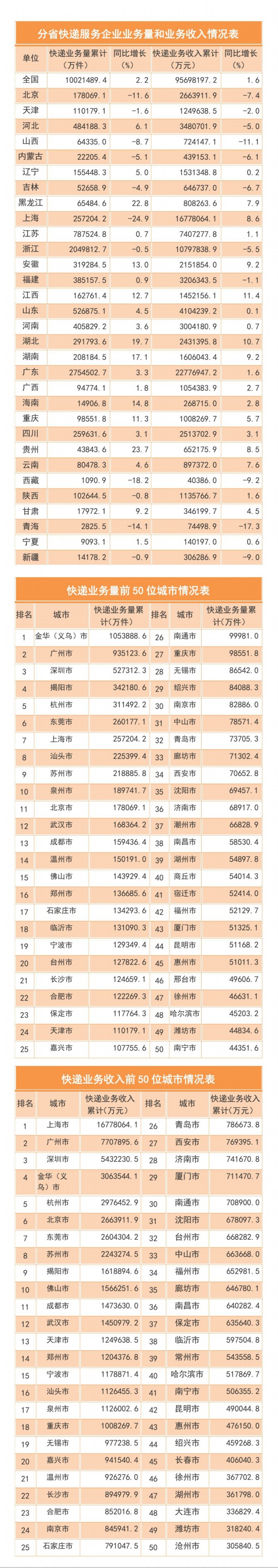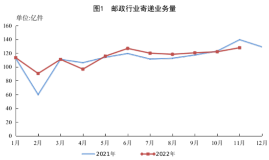 11月份,邮政行业寄递业务量完成127.9亿件,同比下降8.4%。其中,快递业务量完成103.5亿件,同比下降8.7%;邮政寄递服务业务量完成24.4亿件,同比下降6.9%。