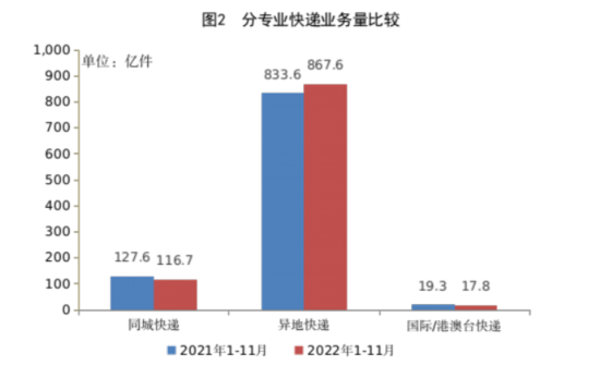 1-11月,同城快递业务量累计完成116.7亿件,同比下降8.5%;异地业务量累计完成867.6亿件,同比增长4.1%;国际/港澳台业务量累计完成17.8亿件,同比下降7.5%。