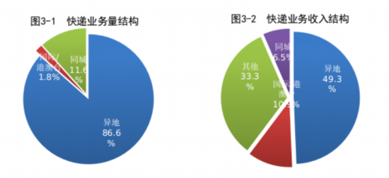 1-11月,同城、异地、国际/港澳台快递业务量分别占全部快递业务量的11.6%、86.6%和1.8%;业务收入分别占全部快递业务收入的6.5%、49.3%和10.9%。与去年同期相比,同城快递业务量的比重下降1.4个百分点,异地快递业务量的比重上升1.6个百分点,国际/港澳台业务量的比重下降0.2个百分点。