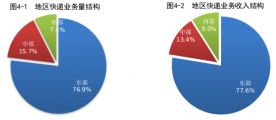 1-11月,东、中、西部地区快递业务量比重分别为76.9%、15.7%和7.4%,业务收入比重分别为77.6%、13.4%和9.0%。与去年同期相比,东部地区快递业务量比重下降1.3个百分点,快递业务收入比重下降0.6个百分点;中部地区快递业务量比重上升1.2个百分点,快递业务收入比重上升0.5个百分点;西部地区快递业务量比重上升0.1个百分点,快递业务收入比重上升0.1个百分点。