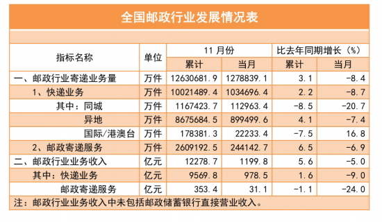 11月份,邮政行业业务收入(不包括邮政储蓄银行直接营业收入)完成1199.8亿元,同比下降5.0%;其中,快递业务收入完成978.5亿元,同比下降9.0%;邮政寄递服务业务收入完成31.1亿元,同比下降24.0%。