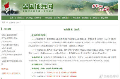 据全国征兵网消息,2023年上半年女兵应征报名于2023年1月1日开始,2023年2月10日18时结束。年满18至22周岁的普通高等学校和科研机构全日制应届毕业生及在校生,可以报名应征。全日制研究生应届毕业生及在校生放宽26周岁。转发,周知!