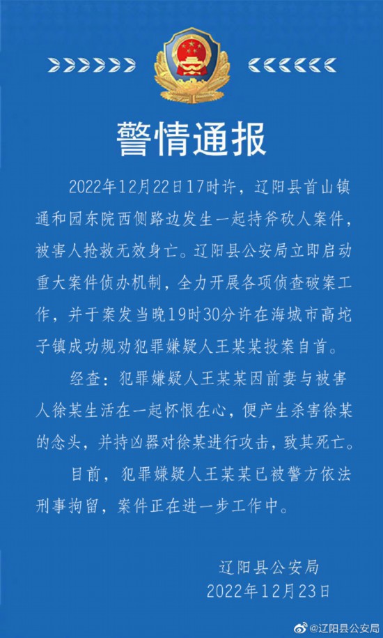 荔枝新闻讯 据辽宁省辽阳市辽阳县公安局通报称,12月22日17时许,辽阳县首山镇通和园东院西侧路边发生一起持斧砍人案件,被害人抢救无效身亡。