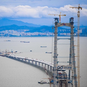 深中通道伶仃洋大桥东塔、西人工岛及远处的深圳市区(2022年6月7日摄)。深中通道全长24公里,集桥、岛、隧、地下互通为一体,连接珠江口东西两岸的广东省深圳市和中山市,预计2024年建成通车。新华社记者 邓华 摄
