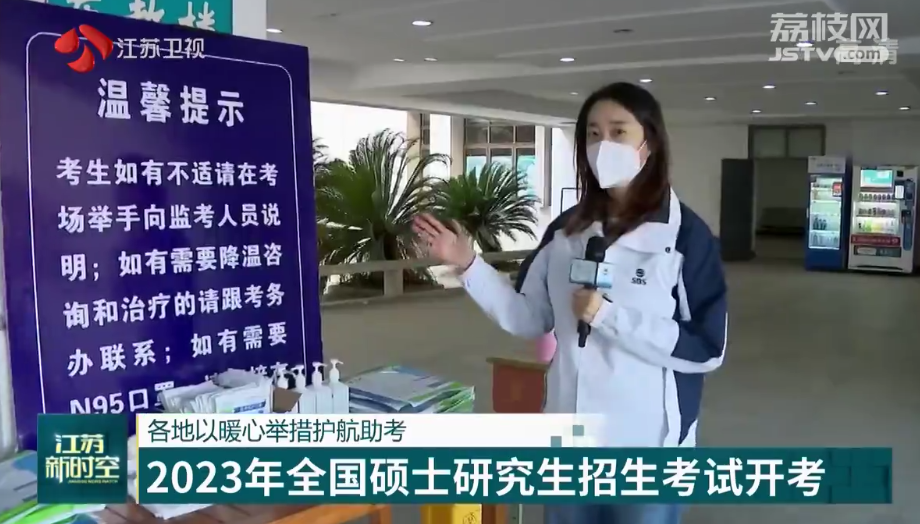 苏州台记者矫荷报道:“这里是苏州大学东校区,也是2023年全国硕士研究生招生考试的考点之一,走进教学楼考点之后,我们看到有一则非常显眼的温馨提示,在前面的桌子上摆放了许多的防疫物资,比如说防护服、N95口罩、手套、测温枪、消毒液,还摆放着一些姜茶,有需要的考生可以在这里随时取用。”