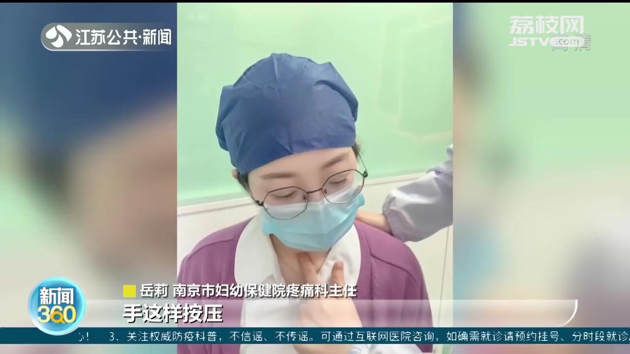 岳莉支招,摸到喉部凹陷的地方,有酸酸涨涨的感觉,这个位置叫“天突穴”,按压一分钟;然后手往喉咙两侧,找到酸胀的感觉按压一分钟,然后再往上按。