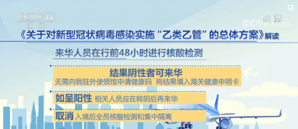 按照《总体方案》要求,来华人员在行前48小时进行核酸检测,结果阴性者可来华,无需向我驻外使领馆申请健康码,将结果填入海关健康申明卡。如呈阳性,相关人员应在转阴后再来华;取消入境后全员核酸检测和集中隔离。健康申报正常且海关口岸常规检疫无异常者,可放行进入社会面;取消“五个一”及客座率限制等国际客运航班数量管控措施;各航空公司继续做好机上防疫,乘客乘机时须佩戴口罩;进一步优化复工复产、商务、留学、探亲、团聚等外籍人士来华安排,提供相应签证便利。逐步恢复水路、陆路口岸客运出入境。根据国际疫情形势和各方面服务保障能力,有序恢复中国公民出境旅游。