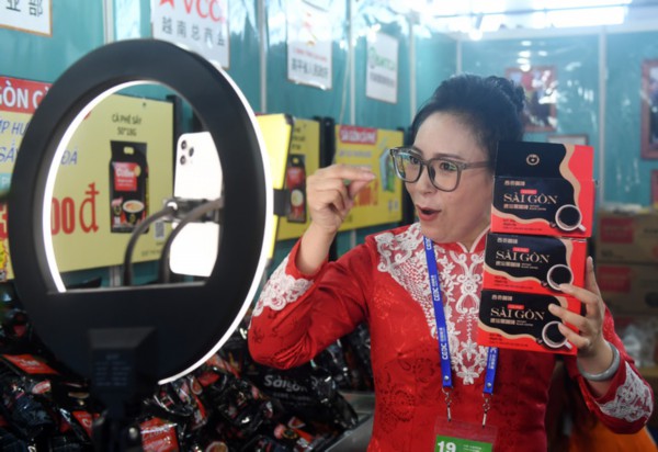 2022年9月19日,在东博会展览现场,一名参展工作人员在通过网络推销越南咖啡。新华社记者 陆波岸 摄