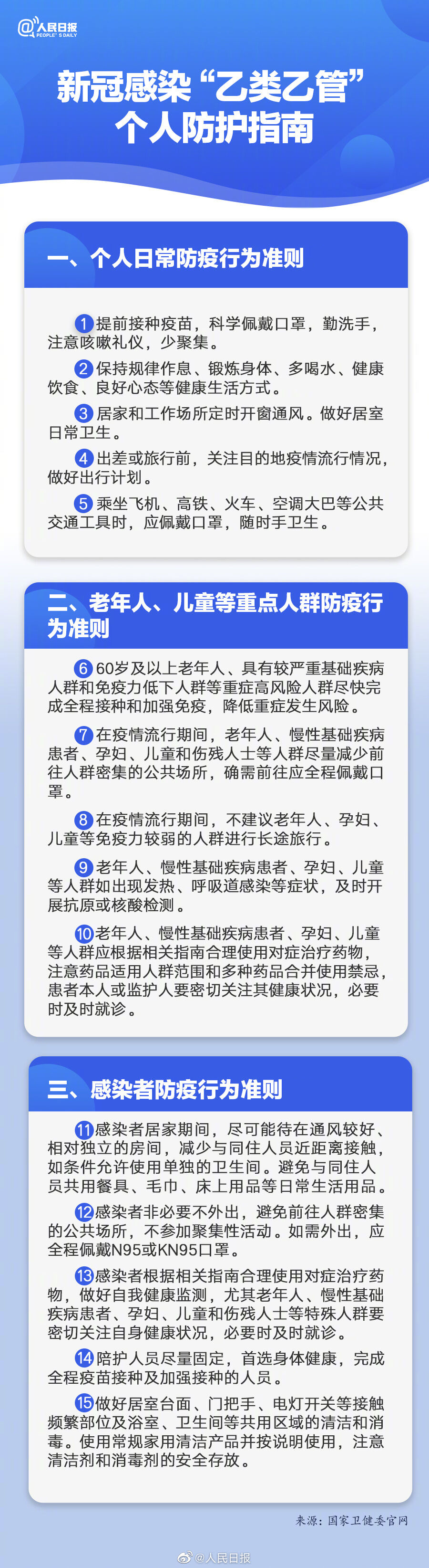 【周知!乙类乙管后个人防护要注意什么】国务院联防联控机制综合组制定《新型冠状病毒感染“乙类乙管”个人防护指南》,涵盖个人日常防疫行为准则、老年人儿童等重点人群防疫行为准则、感染者防疫行为准则。转发提醒!