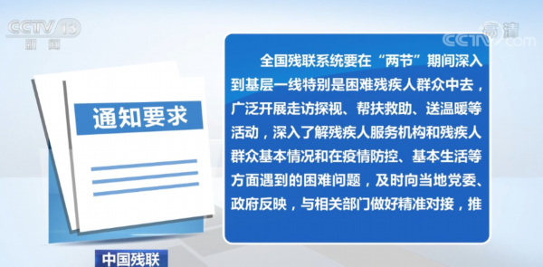 通知要求,全国残联系统要在“两节”期间深入到基层一线特别是困难残疾人群众中去,广泛开展走访探视、帮扶救助、送温暖等活动,深入了解残疾人服务机构和残疾人群众基本情况和在疫情防控、基本生活等方面遇到的困难问题,及时向当地党委、政府反映,与相关部门做好精准对接,推动落实各项社会救助政策,为残疾人群众办实事解难事,保障困难残疾人基本生活,加强矛盾纠纷排查化解,切实维护残疾人群众合法权益,加大对残疾人帮扶救助和安全保护力度。