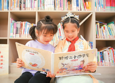 在江苏省如皋市如城街道仙鹤社区农家书屋内,小朋友在阅读节气绘本。