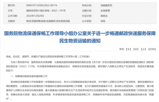 中国网财经12月29日讯 国务院物流保通保畅工作领导小组办公室印发《关于进一步畅通邮政快递服务保障民生物资运输的通知》(简称“通知”),其中提到,各地物流保通保畅工作机制要严格规范邮政快递基础设施关停关闭,依规履行关停关闭审批程序。