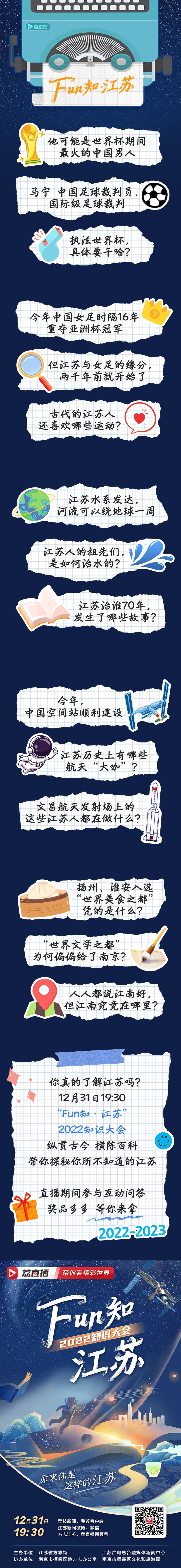 今年,中国空间站顺利建设,江苏历史上有哪些航天“大咖”?文昌航天发射场的这些江苏人都在做什么?中国女足时隔16年重夺亚洲杯冠军,为啥说江苏与女足的缘分自两千年前就开始了?扬州、淮安入选“世界美食之都”凭的是什么?人人都说江南好,但江南究竟在哪里?12月31日19:30,江苏广电总台融媒体新闻中心携手江苏省方志馆举办“Fun知·江苏”2022知识大会,带你探秘你所不知道的江苏!