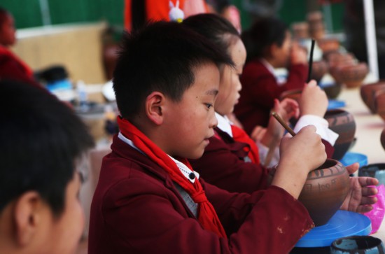 2021年10月,小朋友在仰韶村国家考古遗址公园内的考古体验园绘制纹饰。(新华社记者 许雅楠 摄)