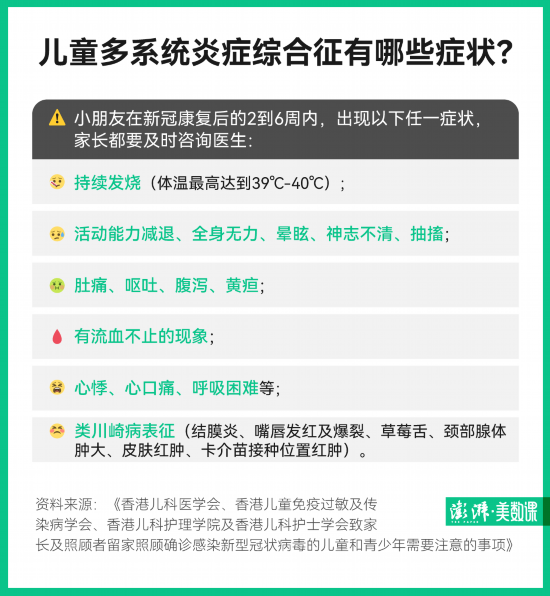 据澎湃新闻消息,一般而言,儿童得新冠后,症状相对成年人都比较轻,但需要警惕的是儿童多系统炎症综合征(MIS-C)。这是一种儿童免疫系统过度所导致的疾病,发炎部位可能包括心脏、肺、肾脏、大脑、皮肤、眼睛或胃肠器官,一般在小孩新冠康复后的2-6周后才会发病。