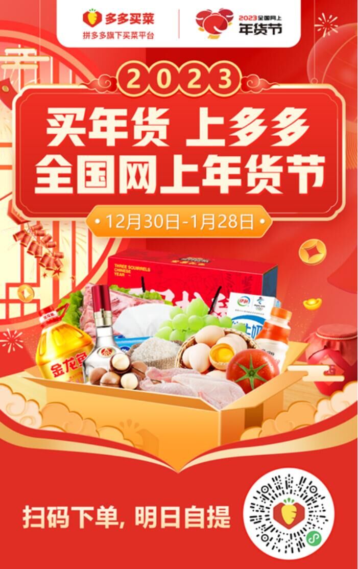 目前,在拼多多主站推出的“2023年货节”主会场,平台将联合全国各省市上千个地标产区,优选百万品质商家,持续倾斜“百亿补贴”“万人团”等价值超过30亿元的站内资源和红包优惠,推动各大原产地把握年货销售旺季,开拓全国市场,带动农民增收,并持续满足城乡消费者的年货需求。