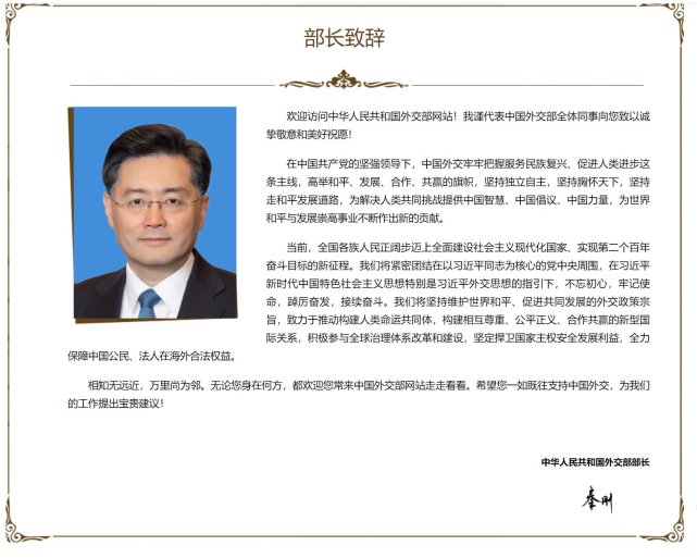 欢迎访问中华人民共和国外交部网站!我谨代表中国外交部全体同事向您致以诚挚敬意和美好祝愿!