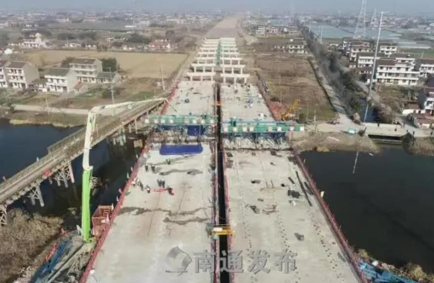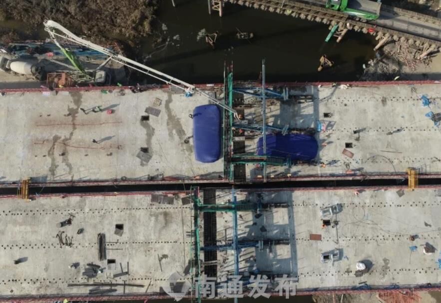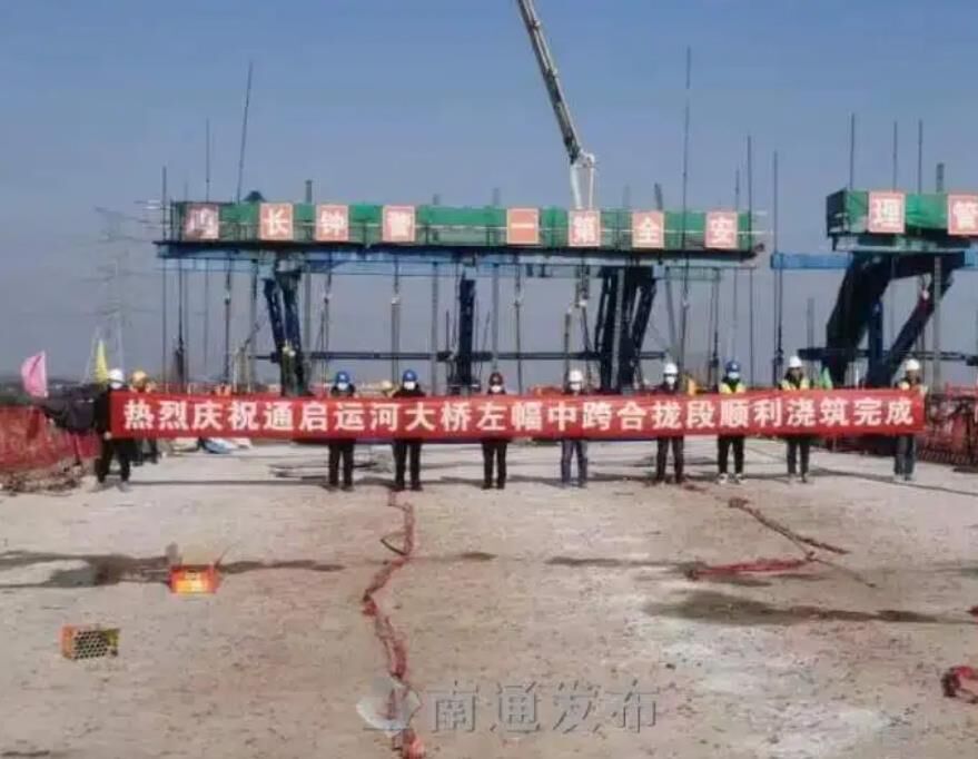 绕城高速全线共有通启运河大桥、通吕运河特大桥、江海河大桥和疏港航道特大桥4座悬浇桥。其中,通启运河大桥位于海门区常乐镇通启运河上,桥梁全长676.36m,包含主桥及南北两侧引桥,桥梁设计线路与通启运河交角为103.5°,桥面采用双向六车道设计,设计速度120km/h,主桥为(36+62+36)m预应力砼变截面连续箱梁,采用悬浇施工。此次浇筑的左幅中跨合龙段混凝土方量36.4方,历时2个多小时完成浇筑。