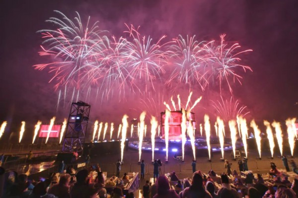 △香港维多利亚港两畔以灯光和焰火迎接新年