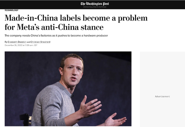 根据该报的介绍,尽管扎克伯格在过去1年里一直在美国政坛煽动恐华舆论,想利用美国的民族主义情绪打压自己的主要竞争对手TikTok,但他的公司Meta在发展虚拟实景和“元宇宙”业务时,却又离不开中国的工厂给他生产几乎所有相关的电子产品。