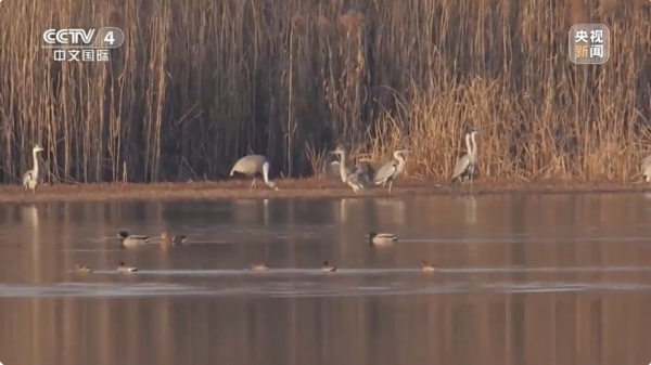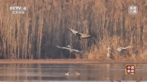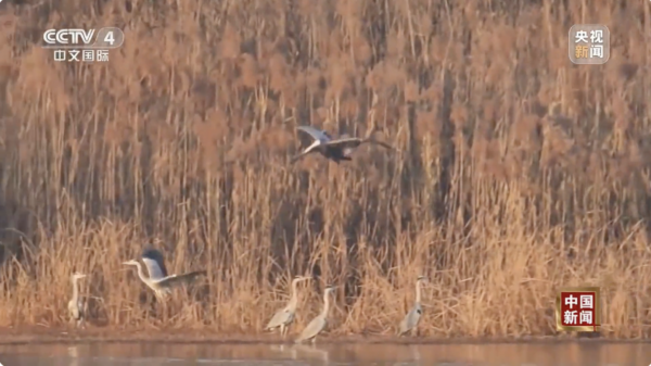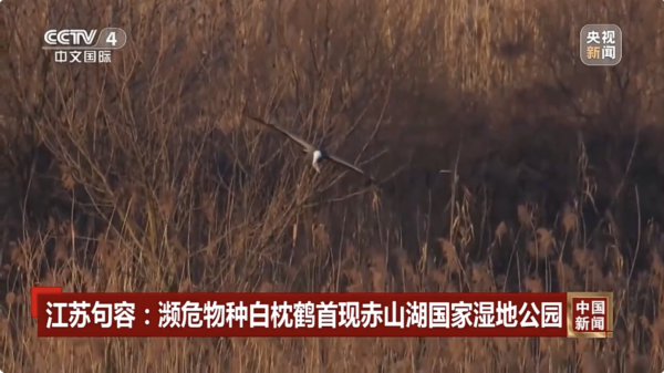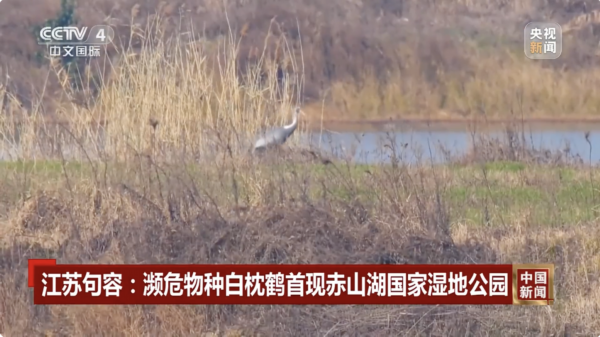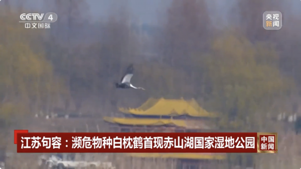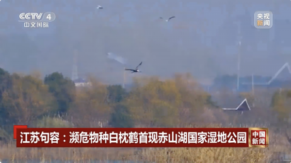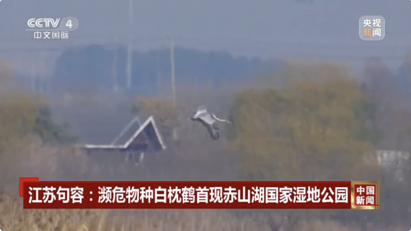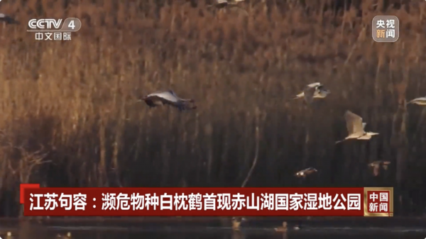 CCTV-4中文国际频道《中国新闻》播出《江苏句容:濒危物种白枕鹤首现赤山湖国家湿地公园》。